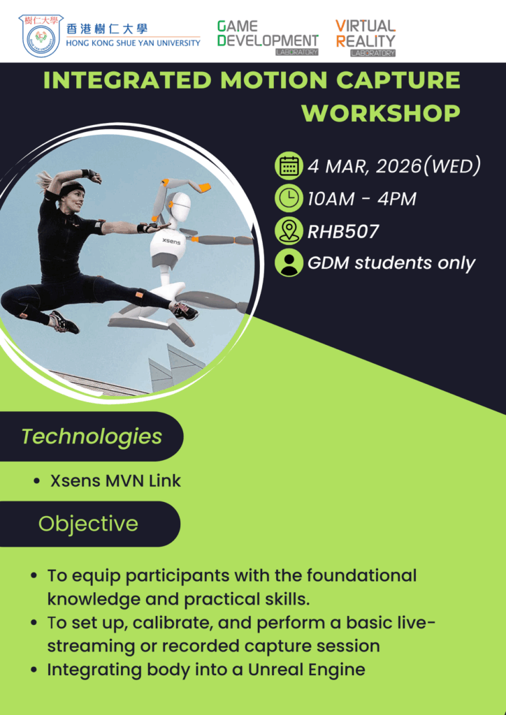 The Game Development Laboratory from the Department of Applied Data Science is delighted to invite all GDM student to an exclusive upcoming Workshop – “Integrated Motion Capture Training”.